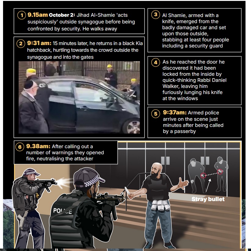 Police beat ‘terrorist’ 2-1 on Manchester synagogue casualties – Synagogue attack – original lie about police shooting two attendees by mistake and killing one of them. Armed police who shot synagogue terror victims, killing one and injuring another, could face criminal charges Greater Manchester Police (GMP) admitted one of the victims of Thursday’s attack died after apparently being injured by a police gunshot. His family tonight described him as a hero. Another person was also injured as police sought to contain the terror threat. It is believed both victims were standing behind a door at Heaton Park Hebrew Congregation Synagogue in Crumpsall when they were hit. Al-Shamie, 35, was shot dead at the scene wearing what appeared to be a suicide vest. The device was later discovered not to be viable. But police do not believe Al-Shamie was armed, meaning the two gunshot injuries were likely from police firearms. In a statement, Emily Barry, director of engagement at the Independent Office for Police Conduct (IOPC), said the watchdog would now investigate. She said: ‘Our thoughts remain with the victims and their families, as well as all those affected by yesterday’s horrific events. ‘As is standard when there has been a fatal police shooting, we are carrying out an independent investigation to establish the facts of what happened, and our findings will be shared with the coroner in due course. ‘IOPC investigators attended the police post-incident procedures and were at the scene last night gathering evidence. We will be present at the post-mortems today to provide independent oversight. ‘It is important in these circumstances that the police are able to continue their vital work, and there are established protocols we follow to ensure our role does not hinder their ability to conduct enquiries as part of their own investigations. ‘We will share further information when we are in a position to do so.’ Adrian Daulby, 53, and Melvin Cravitz, 66, died after Al-Shamie drove into a group of people before stabbing a man. The terrorist was shot dead by police seven minutes after officers were alerted to the attack, which took place on Yom Kippur, Judaism’s holiest day. In a tribute Mr Daulby’s family described him as ‘a hero’ who ‘tragically lost his life in the act of courage to save others’ They said: ‘Adrian was one of the brave worshippers attending the synagogue at the time of incident and prevented the attacker from gaining access to the premises. ‘It is currently believed that Adrian’s injury may sadly have been sustained as a tragic and unforeseen consequence of the urgently required action taken by our officers to bring a vicious attack to an end.’ Yoni Finlay, who is being treated for a non-life-threatening gunshot wound, was holding the doors of the synagogue closed to stop the attacker entering when he was injured during gunfire by police, the BBC reported. Arnold Saunders, a rabbi and Conservative councillor, said Mr Finlay was now ‘stable’ in hospital and ‘out of the woods’.