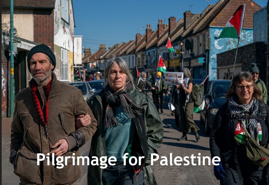 Suzie explains their Pilgrimage 4 Palestine which ended up in Parliament Square – they stayed in Mosques along the way. See Instagram and Facebook. Pilgrimage for Palestine … Pilgrimage for Palestine hit London Parliament Square on a hot 30th March at 2pm. There was amazement and some tears as we paused in Hyde Park, after thirteen days of walking, talking, poetry, generous hosts, massive support, huge donations, canals, rivers, injury, iftar, rapture, waking every day at 3.30am. We paused and waited for the Red Rebels. We being myself on foot, my wife Alice, Nick Bilbrough on bicycle (Hands Up Project founder,) Rowland Dye and Sue Luger, the support team, on foot/van. And a number of supporters who had joined us for the last leg. We moved closer to Parliament Square and waited for the Rebels. They appeared, moving very slowly as they do, as if in shock, dressed in Renaissance velvet red. We followed them into the square, traffic and sunlight and tourists and towers – and Palestinian flags. Right round went the rebels, and we followed, dazed and amazed, stopped at Winston Churchill and began to speak, as Zionists chanted and flung unspecified liquids. A drunk man took our side and wanted to attack them, and was gently diverted. I gave the key round my neck a last kiss and touched it to my forehead, then handed it to a girl in traditional Palestinian dress. This was the key I was given in Bristol by Feda Shahien on the 18th, thirteen days before, the day the sham ceasefire finally collapsed. All along the way it hung round my neck on a strip of cloth from a Palestinian shawl. It is the key to Feda’s grandmother’s house in Palestine, from which she was evicted by the Israelis (that part of history does not exist in Israel.) Once, in Reading, the key fell off. I was speaking at an event at the University, reading poems by Palestinian children collected by the Hands Up Project. The key untied itself from its cloth and fell to the floor, and the floor nearly gave way beneath my feet as I realised they key could have fallen off when I was walking along the canal and been lost. The Kennet and Avon canal rescued us from heavy roads all the way from Bath to Reading. Then the roads claimed us again for one hectic and racist day, when for a moment near Datchet I thought all was lost. Union Jacks everywhere, and a smooth guy rolled past, filming us, saying, ‘No thanks, not in Datchet.’ Then we picked up the Grand Union canal all the way to Paddington.
