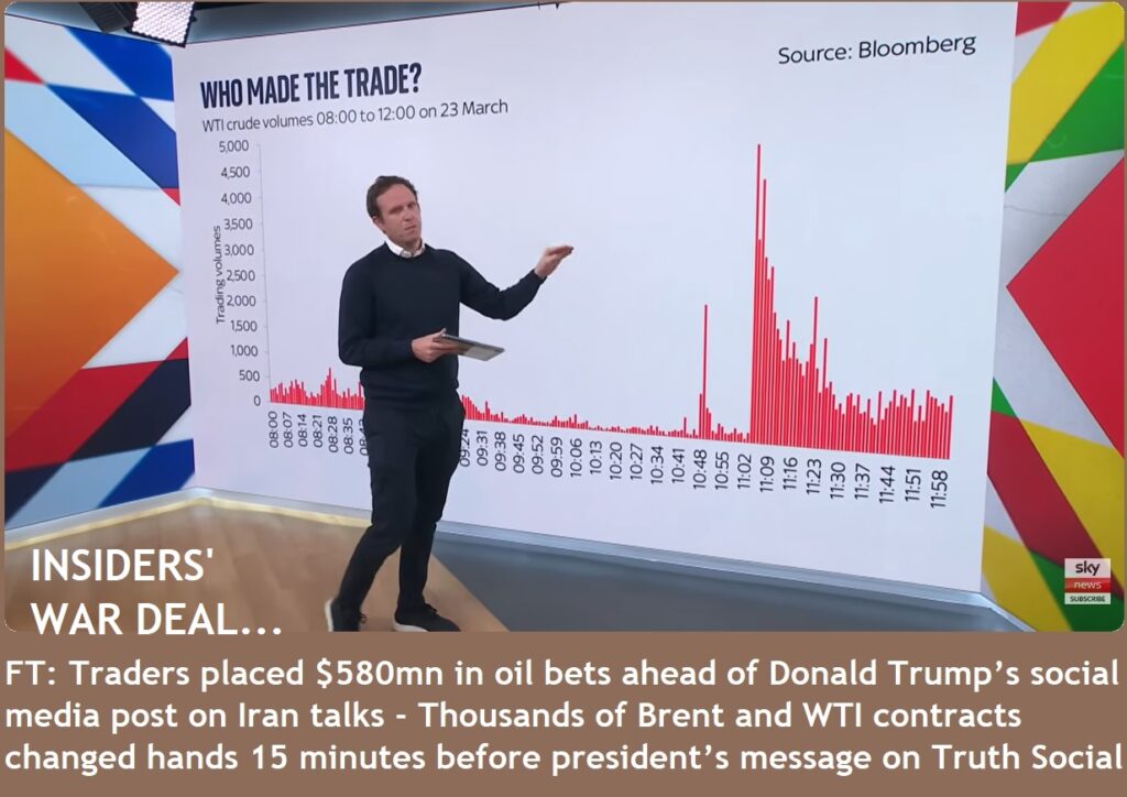 Trump: the Insider Trader’s Perfect President: Unknown traders placed over half a billion in bets minutes before Trump claimed ‘productive’ talks with Iran: Report Open UK oil fields? Sky – large trading volumes on oil 15 minutes before Trump gives statement on Truth Social. Trump speech on how they’re winning. The White House dismissed rumours of insider trading among officials, calling them ‘baseless and irresponsible’ Traders placed more than $500 million in oil bets just minutes before US President Donald Trump claimed talks were happening with Iran and that he was postponing his planned strikes on the Islamic Republic’s power infrastructure, according to the Financial Times (FT). Fifteen minutes before the announcement, a large burst of activity on online markets took place. Over 6,000 Brent and WTI futures contracts changed hands between 6:49 am and 6:50 am in New York in a one-minute flurry worth $580 million, FT reported, citing data from Bloomberg. Volumes in both benchmarks surged simultaneously. Trump’s post was made at 7:04 am and sparked a significant sell-off in energy markets. “It’s hard to prove causality … but you have to wonder who would have been relatively aggressive at selling futures at that point, 15 minutes before Trump’s post,” a broker strategist told FT. According to the report, the timing has raised questions about the trades and who might be benefiting from them. “The only focus of President Trump and Trump administration officials is doing what’s best for the American people,” a White House spokesperson said, calling rumors of insider trading among officials “baseless and irresponsible.” “The White House does not tolerate any administration official illegally profiteering off insider knowledge.” Tehran quickly came out in response to the announcement, denying that any talks took place and vowing to continue fighting. Trump claimed he was speaking to a “top” official, and that talks were “very productive.” According to trading platform Unusual Whales, S&P 500 futures worth $1.5 billion were bought, and oil futures worth $192 million were sold. The FT report comes as concerns have grown about insider trading on platforms such as Polymarket, both in the US and Israel. On 2 March, four days after the start of the US-Israeli war on Iran, Hebrew media reported that Israeli police opened an investigation into a Polymarket account that accurately forecast the 28 February strikes. The Polymarket user, under the name “Magamyman,” reportedly earned about $430,000 by predicting that the US would strike Iran on 28 February. According to Globes, roughly $529 million was bet on when the war would begin, with $90 million riding on 28 February. In mid-February, an Israeli man and an army reservist were indicted on charges of using sensitive, classified information to place bets about military operations. Polymarket is being increasingly used to bet on wars and military operations, sparking concern among some lawmakers that insider information used to place bets could harm national security. In June last year, a user under the name ricosuave666 made several highly accurate bets about the Israeli war on Iran that month, wagering tens of thousands and making a profit of about $150,000. More recently, another user made $400,000 dollars betting on a US assault on Venezuela, just hours before the illegal kidnapping of Venezuelan President Nicolas Maduro was ordered by Trump.