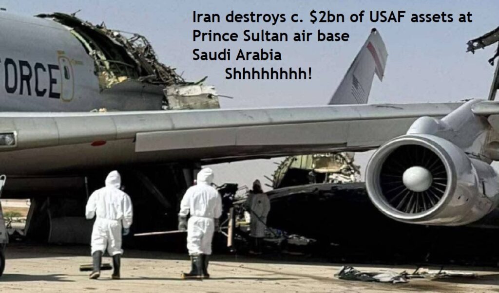 Saudi Arabia releases graphic photos of around $2bn worth of destroyed USAF Sentry and Stratotanker aircraft after Trump says King Mohammed bin Salman has to ‘kiss my ass’. Iran’s Strike on Prince Sultan Air Base Destroyed U.S. E-3 Sentry and May Have Crippled Two “Compass Call” Electronic Warfare Aircraft – The March 27 Iranian missile-and-drone strike on Prince Sultan Air Base in Saudi Arabia may have gone far beyond runway damage, with reports indicating that a U.S. E-3 Sentry and two rare EC-130H Compass Call electronic warfare aircraft were among the high-value assets hit. President Trump mocks Saudi Arabia’s Crown Prince Bin Salman: “He didn’t think he would be kissing my ass, he really didn’t…and now he has to be nice to me….he better be nice to me, he’s gotta be..” Satellite Images Appear to Show Three US KC-135 Tankers Destroyed at Saudi Base, Escalating Iran-US Air War – Newly circulated commercial satellite imagery from Prince Sultan Air Base appears to reveal the destruction of three KC-135 Stratotanker refuelling aircraft, raising urgent questions about the vulnerability of American airpower logistics in the Gulf.