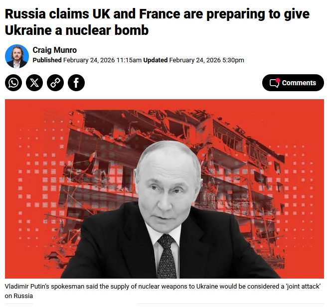 Andrei Kelin, Russian Ambassador to UK, on whether British are going to try and get nukes in to Ukraine. Russia claims UK and France are preparing to give Ukraine a nuclear bomb Vladimir Putin’s spokesman said the supply of nuclear weapons to Ukraine would be considered a ‘joint attack’ on Russia (Picture: Andriy Andriyenko) Russia has marked the fourth anniversary of its full-scale invasion of Ukraine by claiming the UK and France are plotting a nuclear escalation in the conflict. A notice released publicly by the Russian Foreign Intelligence Service – known as the SVR – says it has received information indicating the two countries want to send Ukraine a ‘wunderwaffe’ weapon. The spy agency said: ‘Kyiv will be able to secure more favorable terms for ending the fighting if it possesses a nuclear bomb or at least a so-called “dirty bomb.” ‘Berlin wisely declined to participate in this dangerous adventure.’ This plan was responding to a recognition that ‘the current situation in Ukraine leaves no chance of achieving their much-desired victory over Russia’, according to the SVR. Downing Street said there is ‘no truth’ to the claims from the agency, suggesting it was ‘a clear attempt by Vladimir Putin to distract’ from his actions in Ukraine. He added: ‘You will have seen the Prime Minister’s words this morning, paying tribute to the incredible resilience of the Ukrainians, and you will have seen the package of action on military, humanitarian, reconstruction fronts announced today, which is a sign of where our support is for Ukraine.’ Responding to the claim in a post on X, the French Foreign Ministry said: ‘Five years into its “three-day war”, Russia would really prefer you focus on French and British nukes.’ Bizarrely, the SVR suggested the West would try to cover up the acquisition of the bomb by making it ‘appear to be the result of Ukrainian development’. Ukrainian President Volodymyr Zelensky gives a statement after receiving the 2026 Ewald von Kleist award of the Munich Security Conference (MSC) in the name of the Ukrainian people on February 14, 2026 at the Munich Residence palace in Munich, southern Germany. Ewald von Kleist, founder and long-time guiding figure of the Munich Security Conference, shaped the event for more than 30 years by strengthening the transatlantic security dialogue and helping integrate post-war Germany into NATO and the broader Cold War security framework. Since 2009, the conference has honored outstanding contributions to international understanding and conflict resolution through the Ewald von Kleist Award. (Photo by Michaela STACHE / AFP via Getty Images) Volodymyr Zelensky has suggested Ukraine should either be given nuclear weapons or Nato membershire in the future (Picture: Michaela Stache/AFP via Getty Images) Dmitry Peskov, the top spokesman for President Vladimir Putin, said such a move would be considered a ‘joint attack’ on Russia and called for national and international investigations into the claims. Putin ally and former president Dmitry Medvedev argued it would force Russia to use nuclear weapons on Ukraine and, ‘if necessary, against the supplier countries that become complicit’. Ukraine possessed nuclear weapons in the years after the break-up of the Soviet Union, but gave them up in December 1994 in return for security guarantees from countries including the UK, US and Russia. In October 2024, the country’s President Volodymyr Zelensky suggested this looked like a mistake in hindsight, following the Russian invasion. But he also said that, given the choice between the security provided by a nuclear arsenal or the security provided by Nato membership, he would always choose Nato. This photo cannot be distributed in the Russian Federation. Mandatory Credit: Photo by Ukrinform/Shutterstock (16692045m) Smoke rises from a house ruined by a Russian attack, Sofiivska Borshchahivka village, Kyiv region, Ukraine, February 22, 2026. In the early hours of February 22, Russian forces launched a massive strike on Ukraine using drones and missiles, with Kyiv and the Kyiv region among the targets. Emergency workers rescued a man while responding to the aftermath of the strike in Sofiivska