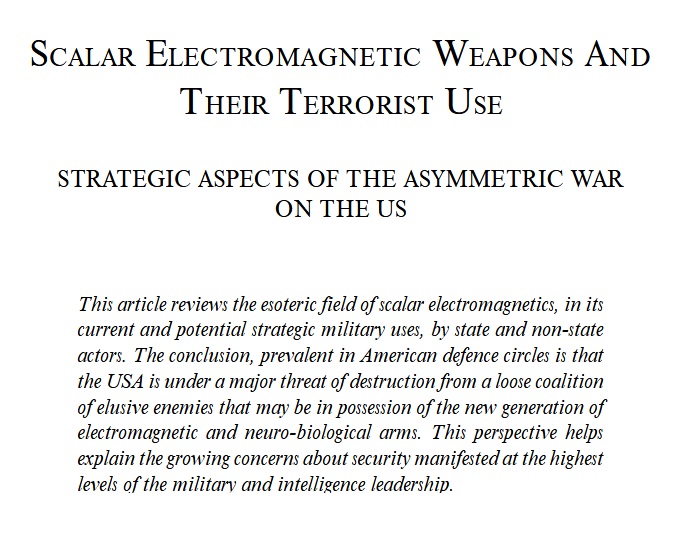 . Or, more simply, one just meets with a fatal auto accident. Or one gets hit with a little microwave “shooter”, whose wavefront has been carefully modified by the Venus ECM technique. That beam will then dramatically disrupt the receiving heart, throwing it into violent and uncontrolled fibrillation. The target falls, goes into convulsions, thrashes a bit, and expires with a legitimate massive stroke, heart attack, or both. The smaller short range shooter is about the size of a small paperback textbook, and fits inside the assassin’s coat pocket. A larger longer range shooter is about the size of a bazooka. It will shoot right through walls and windows, killing a person inside (the target is usually located with an infrared device which allows the assassin to focus on the target’s body heat, even through the wall or window. Or a professional hit man kills the person, making it appear as some hoodlum committing a robbery or some such. Recently Dr. Gene Mallove, an excellent researcher and a highly dedicated scientist, probably was murdered in this latter type of professional hit manner. Those are just a few of the current methods used of professional clandestine assassination or jailing, used against some EFTV researchers. There are many others. But to seek out what our own science is doing in EFTV research, simply go to the websites of the NAS, NSF, DoE, national labs, and universities and search for any real program or solution that would enable our survival in this three year period we have entered. Cut through the rhetoric and hype and examine for real content that would solve the problem. There is none, and there is not going to be any. Instead, the reader will find that “business as usual” and the interests of the powerful scientific cartels ? hot fusion, nuclear power plants, fuel cells, etc. ? are being pursued, with a little sop to the environmentalists in such things as solar cell array power systems, windmill-powered generating systems, etc.