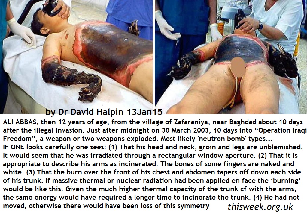 Further evidence of neutron weapon use by Anglo-Zionist empire UK/US: David Halpin. Diary 26May2008 Beyond Horrifying: Child Victim of US Neutron Bomb in Iraq Ten days into Operation Iraqi “Freedom,” 12 year Ali Abbas’ family was burned alive. He, himself, sustained bizarre non-contact heat burns across his torso and his forearms which were both incinerated. The village where this horrifying crime was committed was 30 miles from Baghdad. Ten members of Ali’s family turned into dust and the only evidence of this crime that we have is Ali’s burned body. But these burns, while they result in the same disabilities and liabilities to survivability as if they were contact burns, are not, in fact, contact burns. These are radiation burns. Anyone who has watched what happens to organic material that cooks too long inside of a microwave oven will attest, the substance in the oven burns from the inside, out. But beyond the nature of the burns there is the rectangular area of Ali’s burns: Ali’s head and legs are left intact, suggesting that whatever ionizing radiation struck near his family’s home in March, 2003, that radiation was readily deflected by the everyday building materials available in a Baghdad suburb in 2003. Only neutron radiation can be deflected by common household building materials. Provided that the blast is far enough away from the building to leave it standing, a tactical neutron bomb can readily incinerate human bodies unprotected by distance (from the blast), or common materials (such as graphite) that can readily absorb excess neutrons. The horrifying burns of Ali Abbas, a 12 year old Iraqi child, demonstrate clear evidence that US forces deployed tactical nuclear weapons – neutron bombs – on innocent Iraqi people, burning most of them beyond recognition and thus hastening any clean-up or cover up efforts required by US forces. Odd. Back during WWII the Germans had to dig mass graves to dispose of large quantities of human remains, even after incinerating them in their ovens. We’ve come such a long way in 64 years, I am anxious to see what other “innovations” the slimebag neo conservatives can come up with to readily dispose of our “excess organic material.” For those of you sympathetic to the present administration’s “humanity” rest assured that the techniques used to dispose of “excess” Iraqi biomass will also be deployed on your children, too. In fact, kilojoule for kilojoule, ridding the world of Americans saves energy owing to our incredible appetite for petroleum…and other people’s sovereignty.