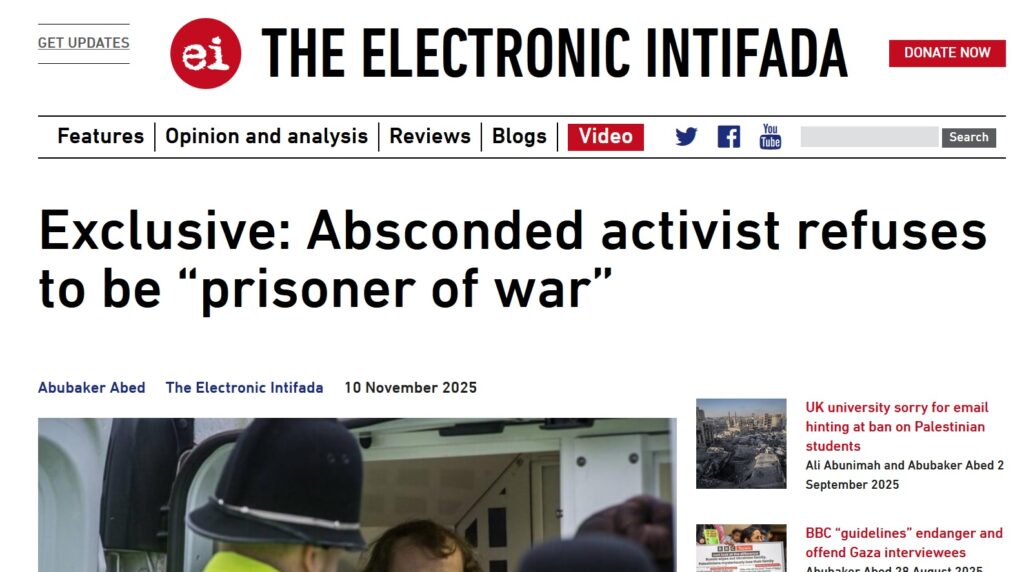 Electronic Intafada – Sean Middleborough, Palestine Action, absconded from prison. Exclusive: Absconded activist refuses to be “prisoner of war” Palestine Action activist Sean Middlebrough, 33, nicknamed Shibby, has absconded from a UK prison after being released on temporary bail for his brother’s wedding. In a statement exclusive to The Electronic Intifada, Middlebrough said he was not a terrorist and should never have been imprisoned in the first place. After a four-day conditional release on 23 October, Middlebrough did not return to Wandsworth prison in London. Despite regular police checks at his home address, he managed to slip away without his family’s knowledge, sources confirmed to The Electronic Intifada. Middlebrough, who is from Liverpool in northwest England, was on remand for a third time in connection with an August 2024 action at an Elbit weapons facility in Filton, a town near Bristol in southwest England. Elbit Systems is one of Israel’s largest arms manufacturers and its British subsidiary, Elbit Systems UK, operates 16 sites across the country. During the Filton action, protestors allegedly drove a van into the factory and damaged Israeli weapons developed there. Middlebrough is accused of causing over $2.5 million in damages. It resulted in, among other things, the destruction of armed quadcopters widely used by the Israeli military in its genocidal aggression in Gaza. Six people were arrested on the spot, detained for 36 hours without legal representation or being able to contact family or the outside world, and charged with criminal damage, aggravated burglary and violent disorder. Further arrests by British counterterrorism police over the following year saw a total of 24 people detained in connection with the Filton action, including Middlebrough. Middlebrough, whose trial date is set for April 2026 and who had already spent a year in pre-trial detention, was facing a total of over 18 months on remand, far exceeding the six-month pre-trial custody time limit. “I am not on the run. I am merely being sensible, refusing to be held as a prisoner of war of Israel in a British prison,” Middlebrough said in a statement obtained and verified by The Electronic Intifada. “Outrageously, 23 of my heroic and honorable co-defendants remain in prison following our kidnapping by counterterrorism police.”…